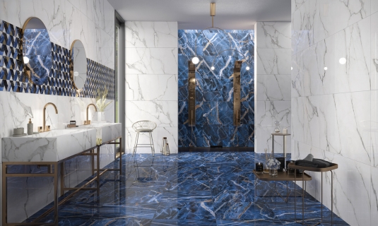 RHAPSODY IS A COMPLETE PROJECT FOR FLOORS AND WALLS WHOSE COLOURS AND TEXTURESARE INSPIRED BY THE WORLD’S FINEST MARBLES, THE CLASSICAL PURE WHITES AND THE DEEPEST BLACKS, ENHANCED BY CONTRASTING VEINING, AS WELL AS THE UNCONVENTIONAL MARBLES DOMINATED BY COBALT BLUE OR STRIKING GOLD VEINING.
