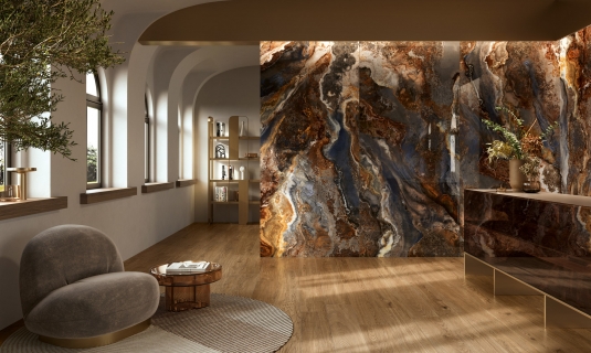 A material palette that defines a new idea of contemporary luxury; Serenade offers 7-mm thick porcelain stoneware with an evocative coloured marble effect.