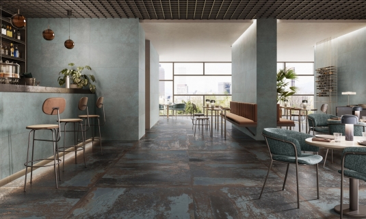 Esprit porcelain stoneware surfaces provide a new interpretation of the industrial aesthetic in contemporary spaces.